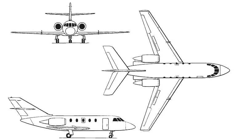 Medium range corporate jet. In service since 1965 (200 since 1981). Initial model of Falcon/Mystère family. Replaced by Falcon/Mystère 200, improved development with more powerful engines,improved range and improved fuel consumption. In production until 1988. Production of Falcon/Mystère 20 ceased in 1983. Used in some military versions as VIP transport, ECM trainer and maritime patrol (U.S. Coast Guard type HU-25 Guardian). Falcon/Mystère 200: MTOW 14,500kg.