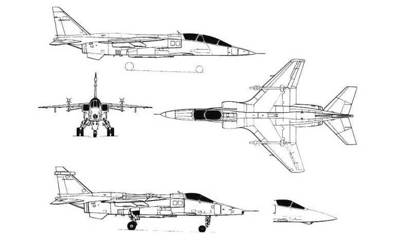 Ground attack aircraft. In service since 1973 (British since 1974). World's first bi-national (British/French) military aircraft development. Built in several versions: GR.1 single seat, T.2 two seat basic version. GR.1A with advanced navigation/attack system. GR.3 with improved ECM system, new LCD screen cockpit and more powerful Adour MX 166 turbofans. Jaguar International (largest customer India) based on Jaguar GR1. Licence production by HAL, India as Shamsher.
