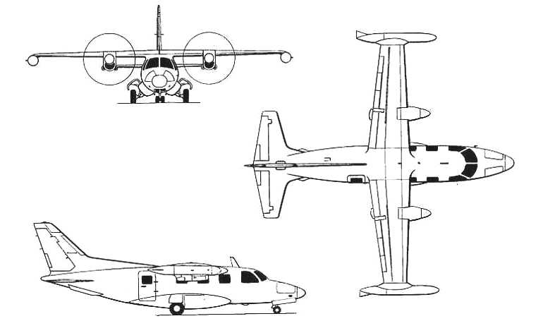 MU-2: 2 x 605 SHP Garrett TPE331-25A or 2 x 724 SHP Garrett TPE331-G-251M turboprops with 3 blade propellers.