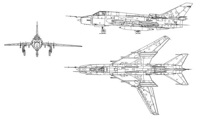 Ground attack fighter. In service since 1970. Improved swing-wing development of Su-7. Built in many versions. Su-20 for export, Su-17R and Su-20R reconnaissance versions. Improved development Su-17M2 and shorter Su-17M2D since 1974. Improved export development Su-22. Su-17U and Su-22U two seat trainer versions. Su-17M3 and two seat Su-17UM3 with modified tail. In 2000 in wide spread use in Russia, Eastern Europe and the Middle east.