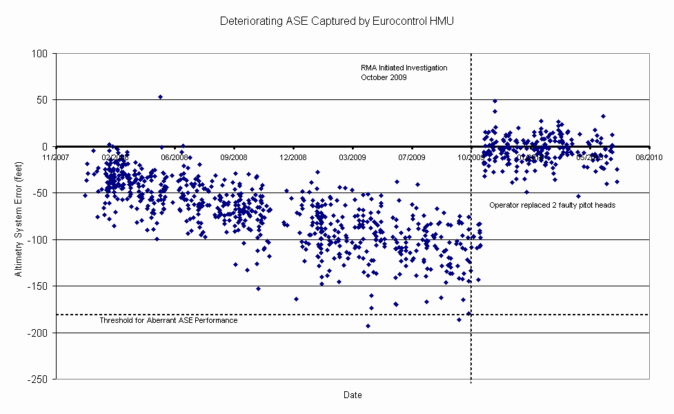 The graph below shows the ASE curve for an individual airframe showing an increase of ASE from approximately -50 feet to over -150 feet in 1 year. The vertical line illustrates when this aircraft came to the attention of the EUR RMA and took action. Improvement in performance after the operator changed faulty pitot heads is clear to see.