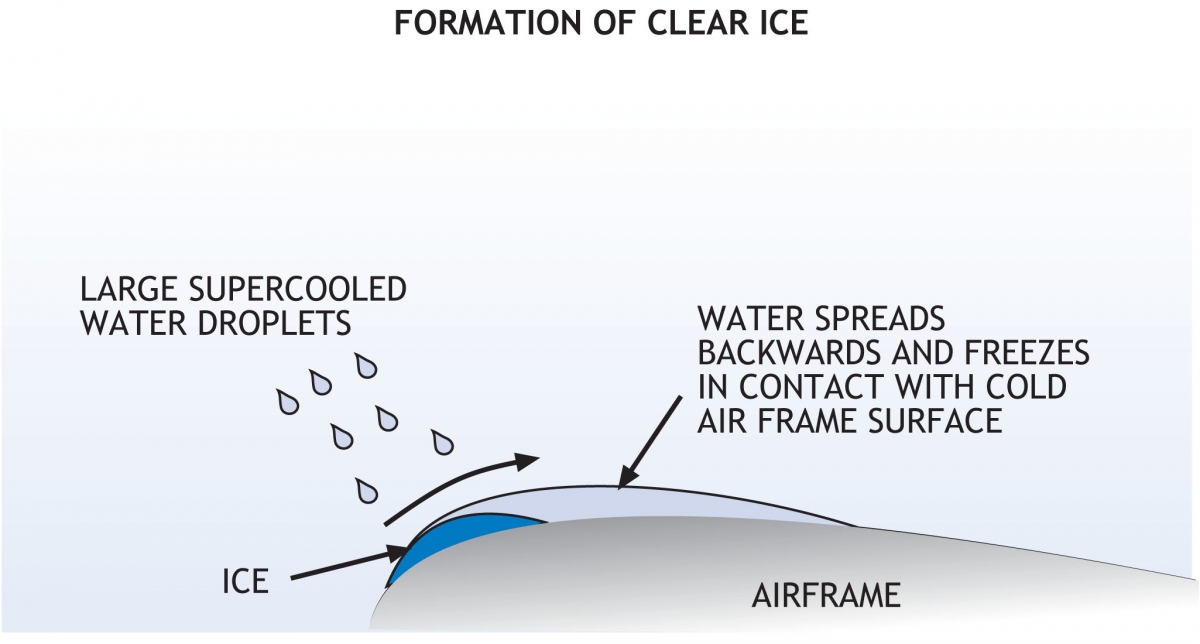 Clouds can support high concentrations of liquid water with relatively large drop sizes. When these water drops are carried above the freezing level, they become supercooled. Because of their large drop size they do not freeze instantly on contact with the aircraft surface but freeze gradually as they flow back across the surface, leaving a smooth, hard, glossy, and transparent covering of ice over the wing surface called clear ice. Clear icing is most significant in the range of 0c to -20c. Ice accretion can be very fast in the highest concentrations of supercooled water.