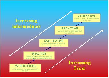 A company’s safety culture is an intrinsic characteristic of the company itself. It is an inherent part of the operation of the organization and must be based on high levels of information sharing and trust between management and the work force. P. Hudson (2001) has developed a model of the evolution of the safety culture in an organization as a function of increasing levels of information and trust. The model, shown in Figure 1, has five stages that proceed from almost a total disregard for safety to a culture in which safety is the preeminent company value.