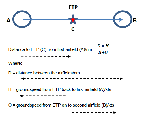 Identification of the ETP (C) for an aircraft flying between 2 airfields, A & B, which are on, or close to, track can be achieved by using the following formula: