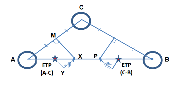 The graphical solution to an ETP problem where a third (en-route diversion) airfield is involved is shown below. The aircraft is flying from A to B and the diversion C lies to one side of track. The requirement is to establish ETPs between A and C, and also C and B.