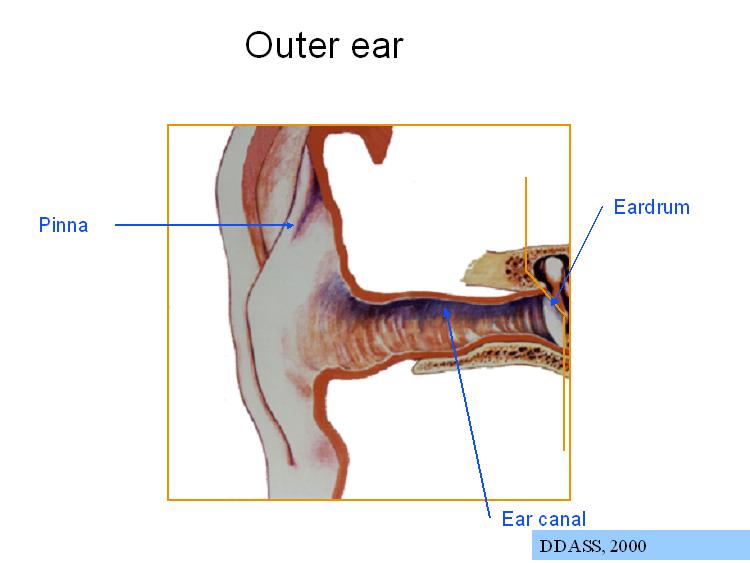 The outer ear consists of the pinna and the ear canal. Sound waves are collected by the pinna and travel through the ear canal to the tympanic membrane (eardrum). Sound waves striking the eardrum cause it to vibrate. The eardrum separates the outer ear from the middle ear (Figure 2).