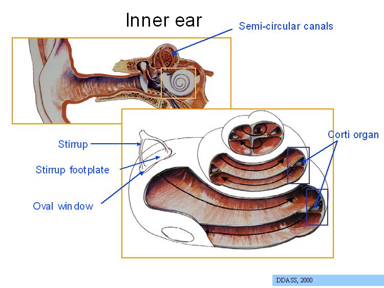 The inner ear contains the corti organ which is the hearing sensor. The process of hearing involves the transmission of vibrations and the generation of nerve impulses. When sound waves enter the ear canal, vibrations are transmitted by the following sequence of structures: eardrum, malleus, incus, stapes, oval window of the inner ear, perilymph and endolymph within the cochlea and hair cells of the organ of corti. When the hair cells bend, they generate impulses that are carried by the 8th cranial nerve to the brain. Sounds are heard and interpreted in the auditory areas of the temporal lobes.