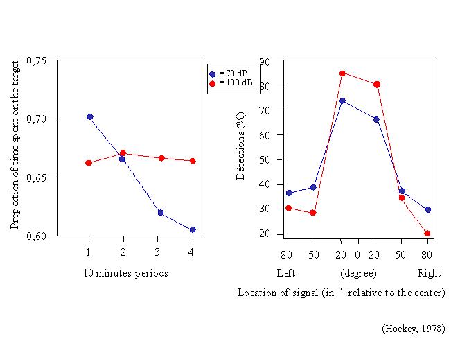 Hockey further explored this topic in an experiment where subjects were asked to perform a tracking task and a detection task at the same time (Figure 6). For the tracking task, the higher the percentage of time spent on the target, the better the performance. In the detection task, performance was measured as correct detection of a signal. Results showed that higher levels of noise actually helped to maintain performance on the tracking task over time. For the detection task, noise improved detection of the signals located in the center of the field of vision, but decreased detection performance when the signal was in the periphery.