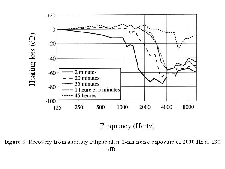 Figure 8 shows that this shift can reach up to 40 dB after exposure to 106 dB for 100 minutes. Simply put, an increase of 40 dB in a signal would be needed for a person to hear with the same acuity as before the exposure to the 106 dB noise for 100 minutes.