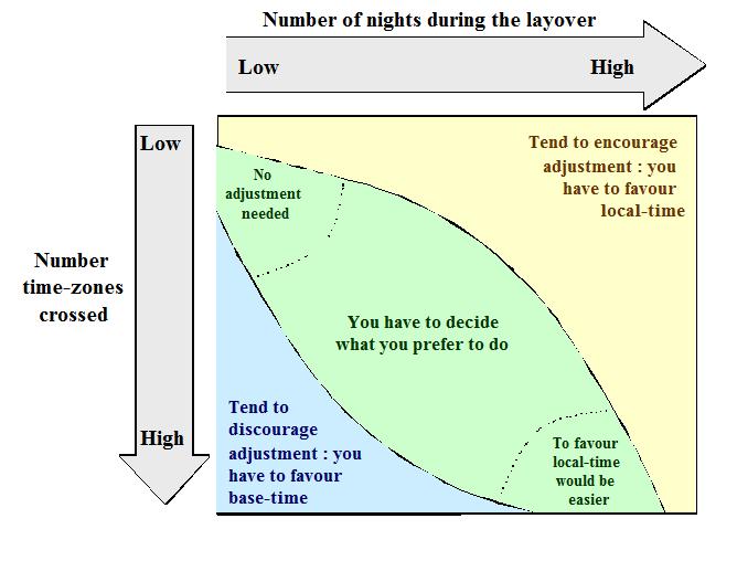 - For the conditions in between, the crewmember must decide whether to try to adjust to local time. Choices should be based on experience and subjective feelings (depending on the ease with which a person can adjust and what he or she prefers to do during the layover).