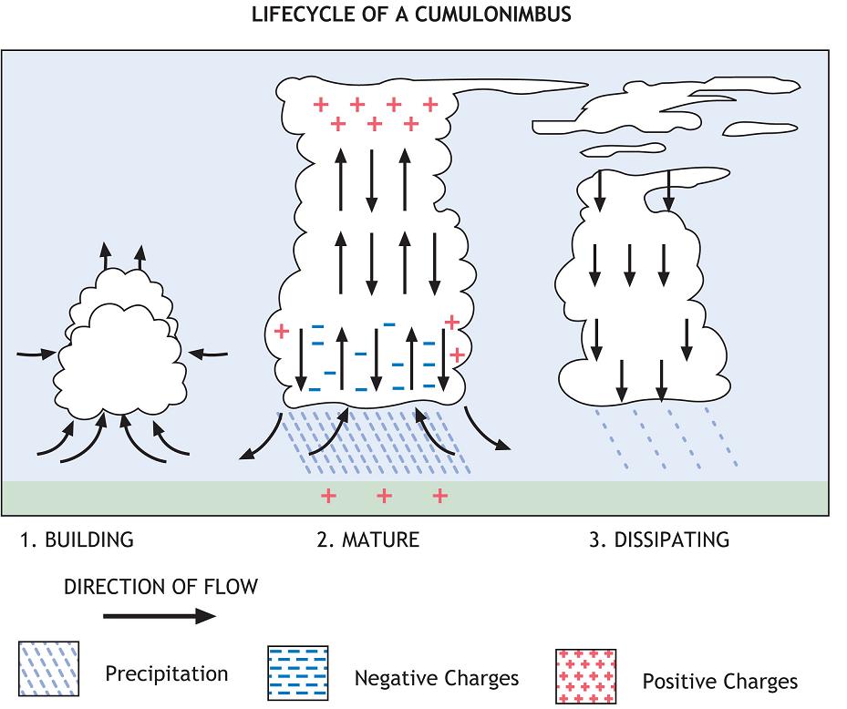 - Mature Phase. As the top of the cloud reaches great heights, precipitation begins to fall. The falling rain, snow and/or ice (Hail) cools the surrounding air creating downdrafts. The friction between ice particles descending through the cloud, and ice particles being carried aloft by the updrafts, creates a static charge in the cloud with the top of the cloud having a positive charge and the bottom of the cloud having a negative charge. Eventually the difference in potential is so great that powerful electrical discharges (Lightning) occur, accompanied by Thunder. The top of the cloud begins to flatten out and Cirrus like cloud, consisting of ice crystals, spreads out creating a distinctive anvil shape.
