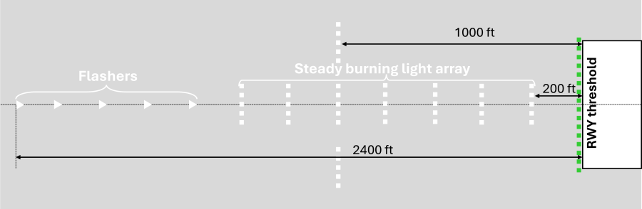 - Steady burning lights. These form an array of nine sets (called light bars), each consisting of five aviation white steady burning lights. Seven of the light bars are located at 200 ft intervals along the extended runway centreline and the other two are offset to the left and right of the extended centreline at the 1000 ft bar.