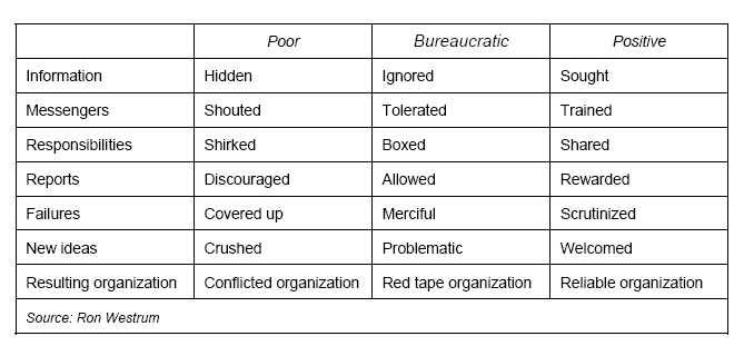 Organisational literature proposes three types of organisations, depending on how they respond to information on hazards and safety information management:
