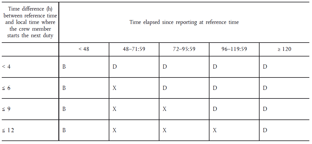 "Acclimatised" means a state in which a crew member’s circadian biological clock is synchronised to the time zone where the crew member is. A crew member is considered to be acclimatised to a 2-hour wide time zone surrounding the local time at the point of departure. When the local time at the place where a duty commences differs by more than 2 hours from the local time at the place where the next duty starts, the crew member, for the calculation of the maximum daily flight duty period, is considered to be acclimatised in accordance with the values in the Table 1, where:
