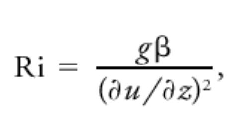 The Richardson number, Ri, is the dimensionless ratio of buoyant suppression of turbulence to shear generation of turbulence and is defined as: