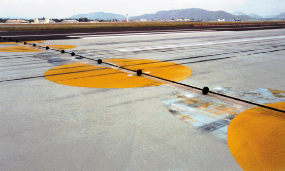 - a series of reflective yellow circles each of diameter 10 feet /3.05 metres and 15 feet / 4.57 metres apart from edge to edge which extend across the full width of the runway such that the middle two circles straddle the runway centreline. Runway Designators must not be compromised and interference with normal runway markings should be avoided if possible.