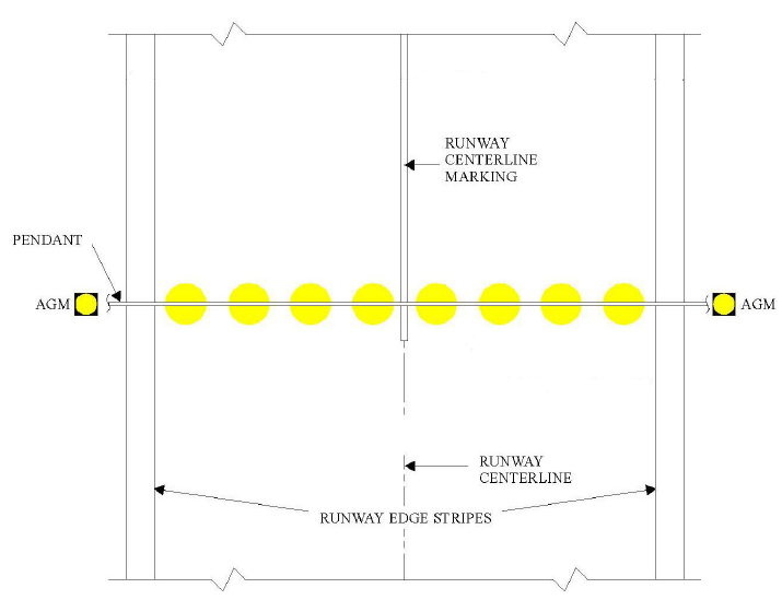 - Arrestor Gear Markers (AGMs) taking the form of an internally-lighted yellow translucent circle approximately 39 inches / 1 metre in diameter on a square black background should be present on both sides of the runway at or within 10 feet /3 metres of the cable position and equidistant from the runway edge.