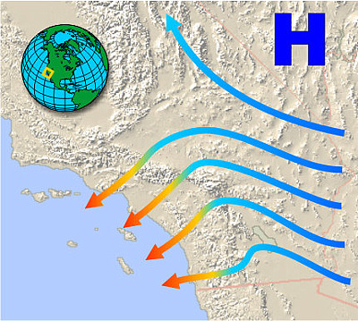 The Santa Anas are katabatic winds arising in higher altitudes and blowing down towards sea level - strong, hot, dust-bearing winds descending to the Pacific Coast around Los Angeles from inland desert regions.