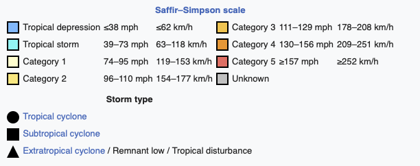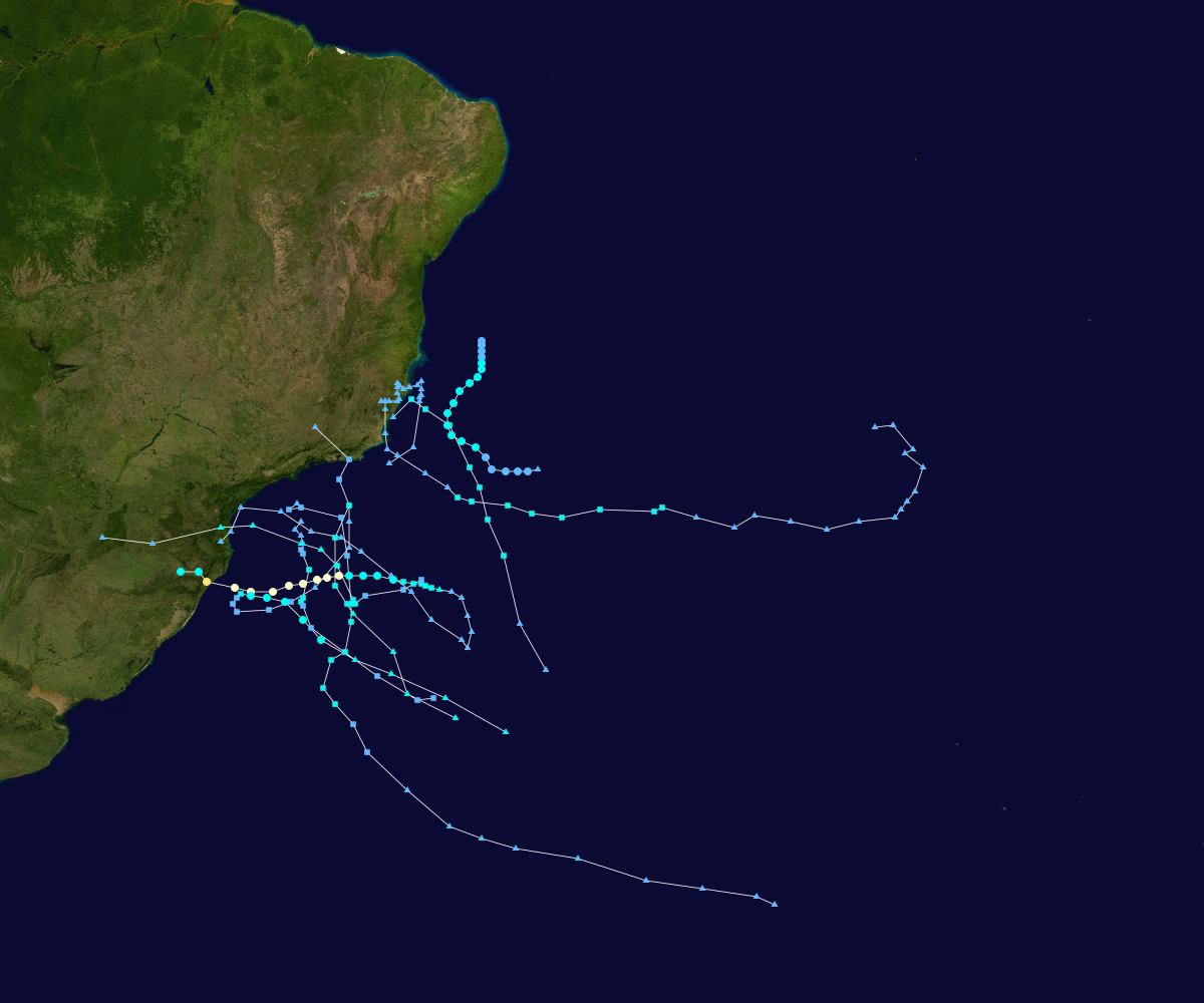 Track map of all significant systems of the South Atlantic tropical cyclone. The points show the location of the storm at 6-hour intervals. Source: Wikicommons