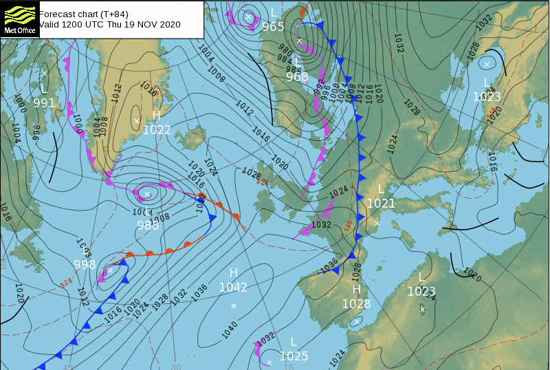 Surface chart forecast for North East Atlantic, 19 November 202, issued by UK Met Office