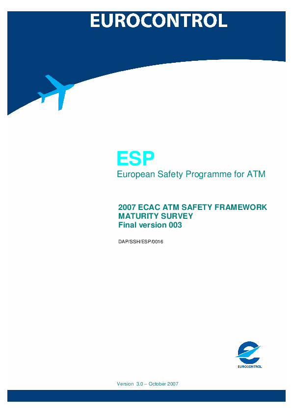 This survey report provides a comparative overview of the extent to which ANSPs and Regulators in each State of the ECAC region have developed their safety management and safety regulatory frameworks. The ATM safety frameworks within ECAC have been evolving over a number of years in order to comply initially with the Strategic Safety Action Plan (SSAP) requirements from 2002-2006 inclusive and in 2007 with the first year of the European Safety Plan. The 2007 safety maturity survey was carried out using methods which were fully compatible with those used during the previous SSAP surveys.