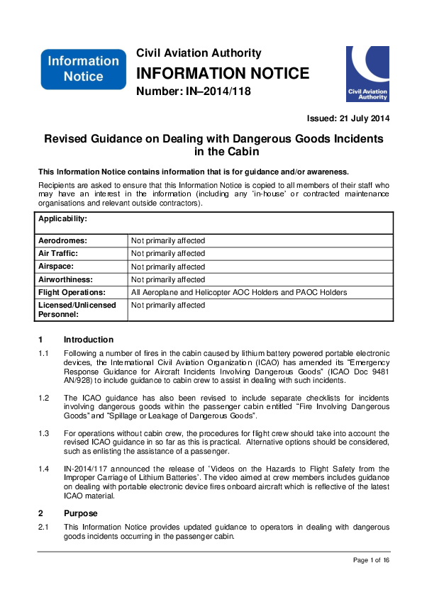 Following a number of fires in the cabin caused by lithium battery powered portable electronic devices, the International Civil Aviation Organization (ICAO) has amended its Emergency Response Guidance for Aircraft Incidents Involving Dangerous Goods (ICAO Doc 9481 AN/928) to include guidance to cabin crew to assist in dealing with such incidents. This Information Notice provides updated guidance to operators in dealing with dangerous goods incidents occurring in the passenger cabin.