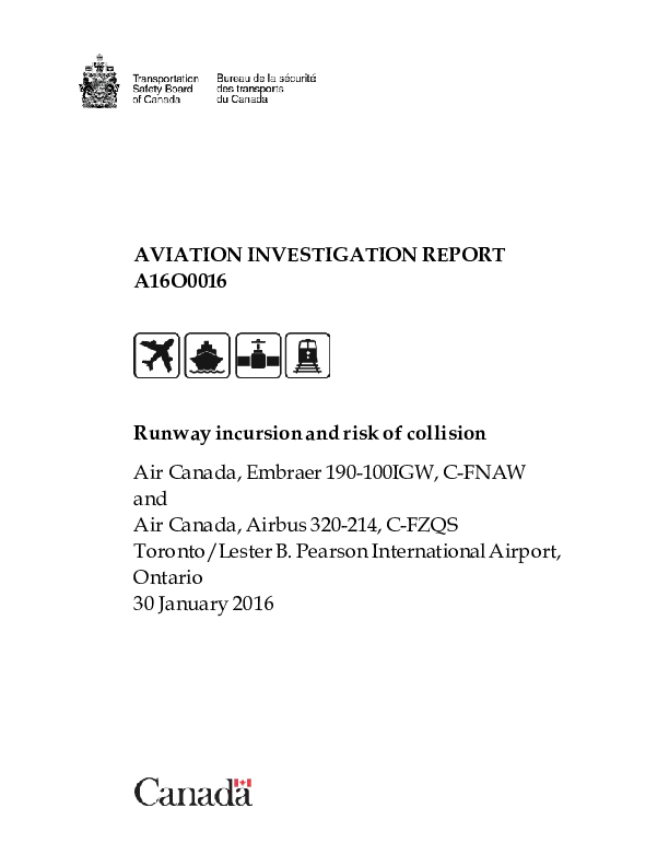 On 30 January 2016, the Air Canada Embraer 190-100IGW (registration C-FNAW, serial number 19000149) was operating as flight 726 (ACA726) on a scheduled flight from Toronto/Lester B. Pearson International Airport, Ontario, to LaGuardia Airport, New York, United States. ACA726 taxied over the hold line and onto Runway 24R without authorization at the same time that an Air Canada Airbus 320-214 (registration C-FZQS, serial number 2145) operating as flight 1259 (ACA1259), was on final approach for landing on the same runway. At 2101:38 Eastern Standard Time, as ACA726 was turning onto the runway centreline, the flight crew of ACA1259, which was now 0.41 nautical miles from the Runway 24R threshold and at 270 feet above ground level (AGL), reported to the airport controller that there was an aircraft on the runway and that they were overshooting the runway. ACA1259 was climbing through 580 feet AGL when it flew over ACA726. Air traffic control had not been aware of the runway incursion before being notified by ACA1259 that there was an aircraft on the runway. The incursion occurred during hours of darkness.
