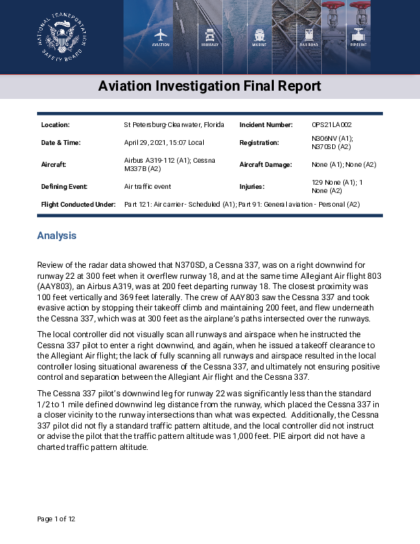 On 29 April 2021, the crew of an Airbus A319 which had just taken off from runway 18 at St Petersburg saw a Cessna M337 about to cross their intended track close to the same height and levelled off to ensure they passed beneath it achieving a 100 feet separation. The conflict was attributed to the controller’s general loss of situational awareness and his failure to properly scan airspace in the vicinity of the airport. The Cessna 337 pilot’s failure to fly at the standard circuit height or track downwind at the standard distance from the runway was deemed contributory.