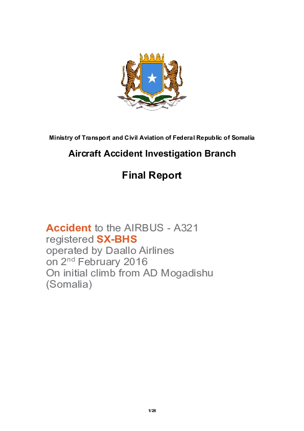 A321 (SX-BHS), north of Mogadishu Somalia, 26 February 2016