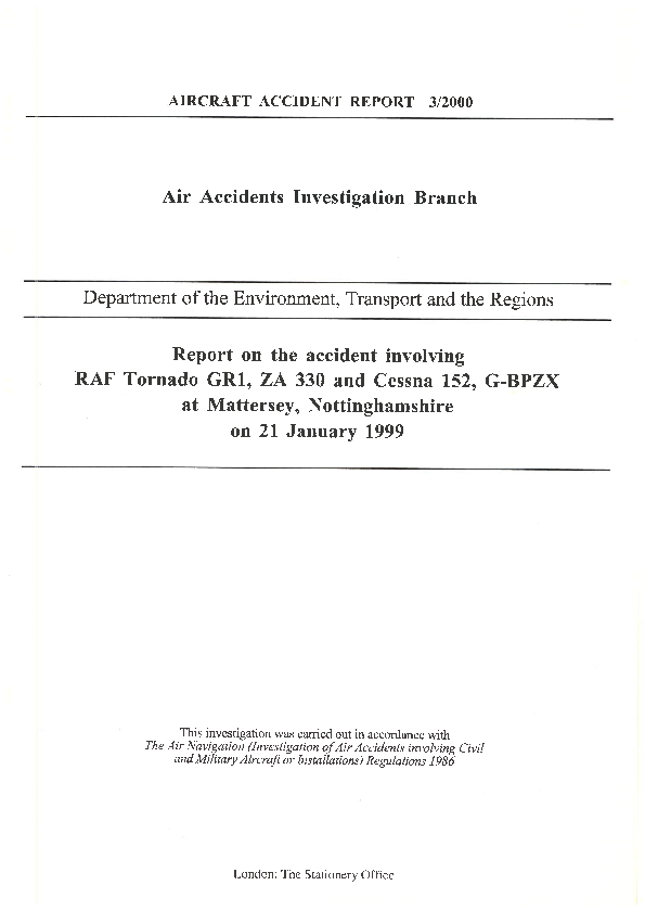 AAIB Aircraft Accident Report 3/2000, RAF Tornado GR1, ZA 330/Cessna 152, G-BPZX, Mattersey, Notti