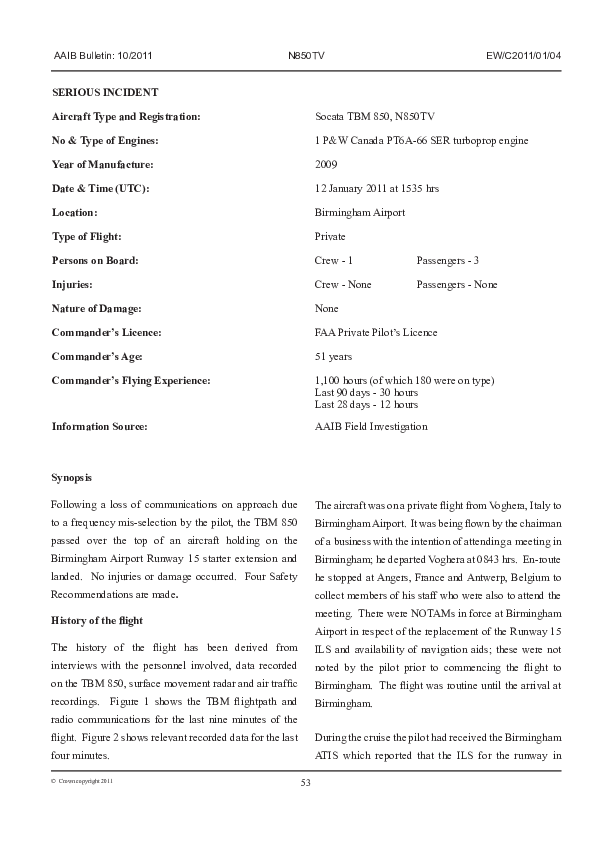AAIB Bulletin 10/2011 EW/C2011/01/04, Socata TBM 850, N850TV, Birmingham UK, 12 Jan 2011