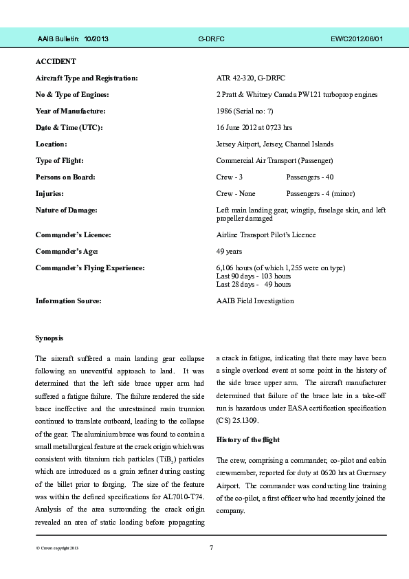 On 16 July 2012, the left main landing gear of a Blue Islands ATR 42-300 collapsed during landing at Jersey. The aircraft stopped quickly on the runway as the left wing and propeller made ground contact. Although the crew saw no imminent danger once the aircraft had stopped, the passengers thought otherwise and perceived the need for an emergency evacuation which the sole cabin crew facilitated. The Investigation found that the fatigue failure of a side brace had initiated the gear collapse and that the origin of this was a casting discontinuity in a billet of aluminium produced to specification.