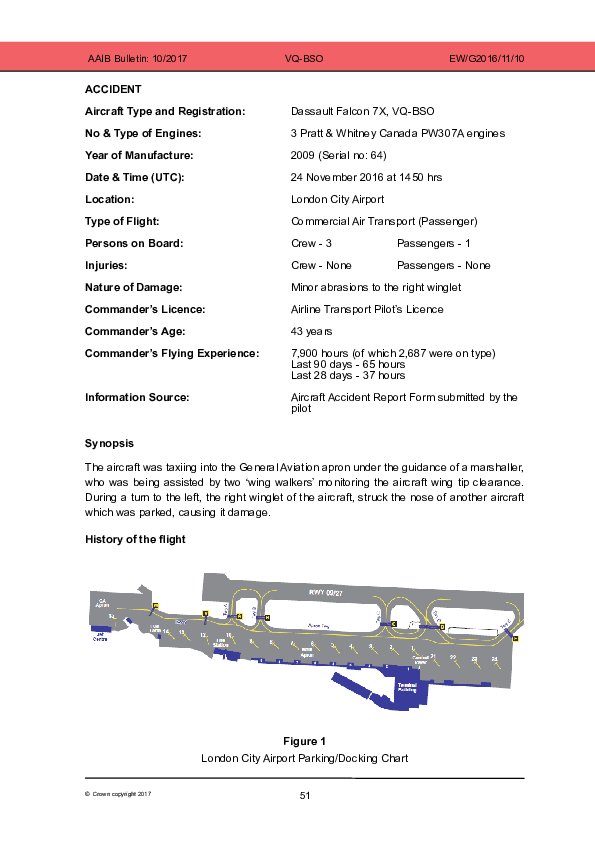 On 24 November 2016, a Dassault Falcon 7X being marshalled into an unmarked parking position after arriving at London City Airport was inadvertently directed into a collision with another crewed but stationary aircraft which sustained significant damage. The Investigation found that the apron involved had been congested and that the aircraft was being marshalled in accordance with airport procedures with wing walker assistance but a sharp corrective turn which created a 'wing growth' effect created a collision risk that was signalled at the last minute and incorrectly so by the wing walker involved and was also not seen by the marshaller.