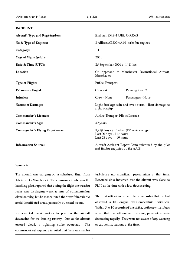On 25 September 2001, an Embraer 145 in descent to Manchester sustained a low power lightning strike which was followed, within a few seconds, by the left engine stopping without failure annunciation. A successful single engine landing followed. The Investigation concluded that the cause of failure of the FADEC-controlled AE3007 engine (which has no surge recovery logic) was the aero-thermal effects of the strike to which all aircraft with relatively small diameter fuselages and close mounted engines are vulnerable. It was considered that there was a risk of simultaneous double engine flameout in such circumstances which was impossible to quantify.