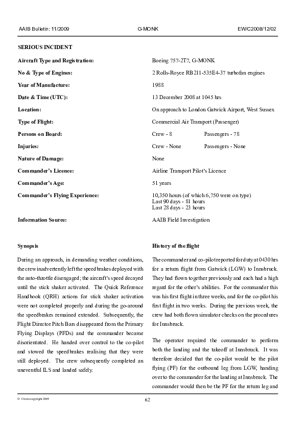 AAIB Bulletin 11/2009 - Serious Incident - Boeing 757-2T7, G-MONK, London Gatwick,13 Dec 2008