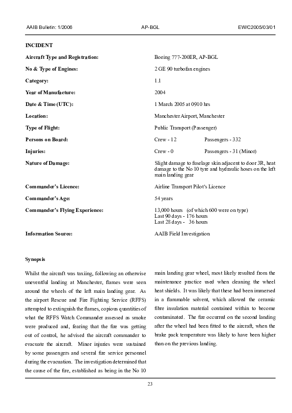 On 1 March 2005, a Boeing 777-200 being operated by Pakistan International Airways on a scheduled passenger flight from Lahore to Manchester experienced a landing gear fire during taxi in at destination after an apparently routine landing in normal day visibility. There were no flight deck indications of a significant fire but an emergency evacuation was recommended by attending Fire Crew and carried out. Thirty one of the 344 occupants sustained minor injuries during this evacuation and the rest were uninjured. Five firefighters also sustained minor injuries as they assisted passengers from the slides. Damage to the aircraft was minor.