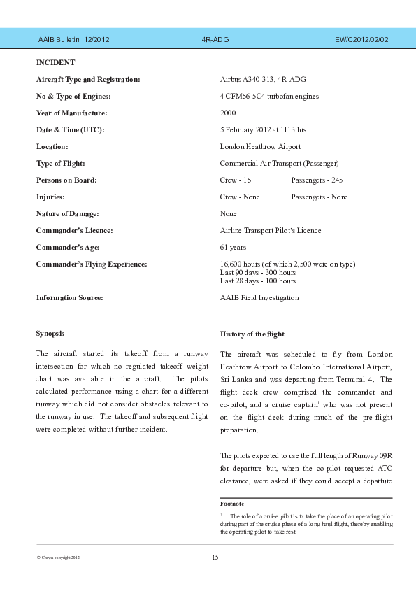 On 5 February 2012, a SriLankan Airlines Airbus A340-300 started its takeoff from an intermediate point on the runway for which no regulated takeoff weight information was available on board the aircraft and was observed by ATC and others to become airborne much nearer to the end of the runway than usual. The subsequent investigation found that the flight crew had relied on data for a different runway which did not consider obstacles relevant to the runway used and determined that the regulatory position in respect of this was deficient, leading to corresponding safety recommendations being made