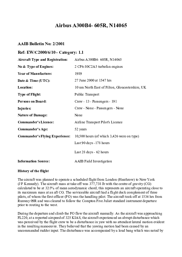 AAIB Bulletin 2/2001 EW/C2000/6/10, Airbus A300B4-605R, N14065, near Filton UK, 27 Jun 2000