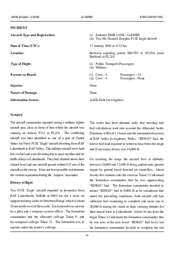 AAIB Bulletin 2/2006 EW/C2005/01/05, Embraer 145EU, G-EMBE / 2x McDonnell Douglas F15E Eagle, Be