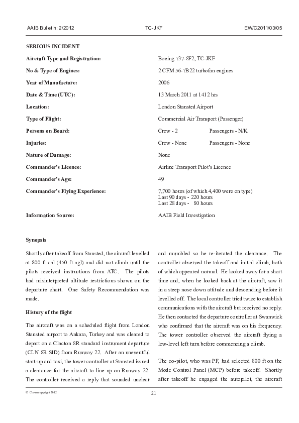 AAIB Bulletin 2/2012 EW/C2011/03/05, Boeing 737-8F2, TC-JKF, London Stansted, 13 Mar 2011