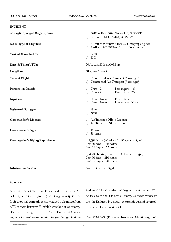 AAIB Bulletin 3/2007 EW/C2006/08/04, DHC-6 Twin Otter, G-BVVK / Embraer 145EU, G-EMBV, Glasgow,