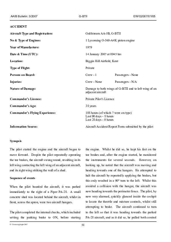 AAIB Bulletin 3/2007 EW/G2007/01/05, Gulfstream AA-5B, G-BTII, Biggin Hill UK, 14 Jan 2007