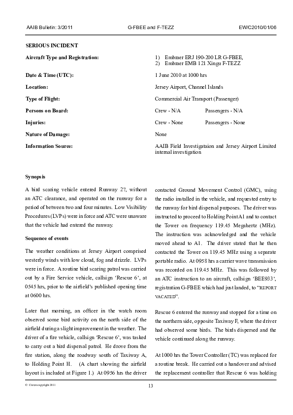 AAIB Bulletin 3/2011 EW/C2010/01/06, Embraer ERJ 190-200LR, G-FBEE / Embraer EMB 121, F-TEZZ, Jersey