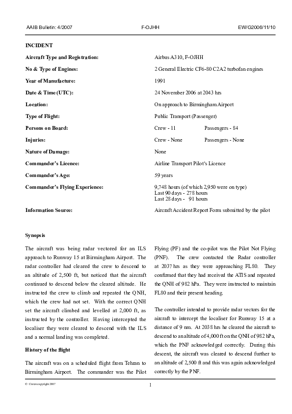 AAIB Bulletin 4/2007 EW/G2006/11/10, Airbus A310, F-OJHH, Birminham UK, 24 Nov 2006