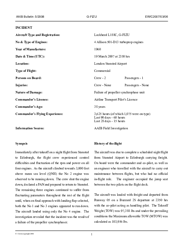 AAIB Bulletin 5/2008 EW/C2007/03/06, Lockheed L188C, G-FIZU, London Stansted, 19 Mar 2007