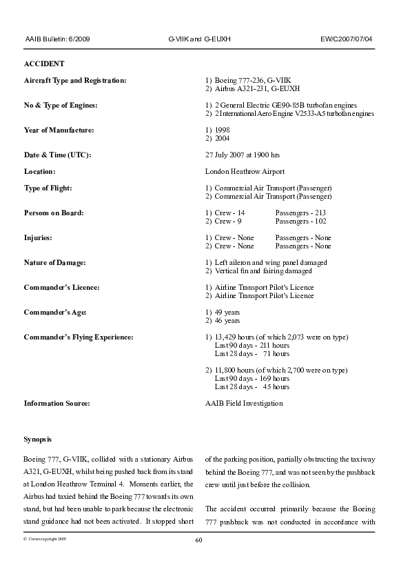 AAIB Bulletin 6/2009 EW/C2007/07/04: Boeing 777-236. G-VIIK / Airbus A321-231 G-EUXH, Heathrow, 27 J