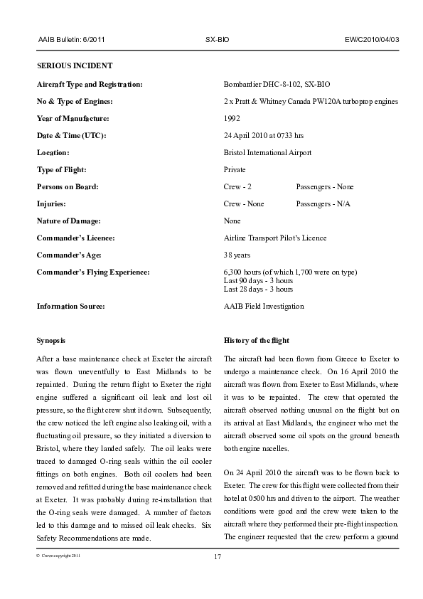 AAIB Bulletin 6/2011 EW/C2010/04/03, Bombardier DHC-8-102, SX-BIO, Bristol International Airport