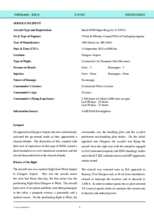 AAIB Bulletin 6/2013 (EW/C2012/09/03), Beech B20 Super King Air, G-SYGA, Glasgow Airport, 15 Sep 201