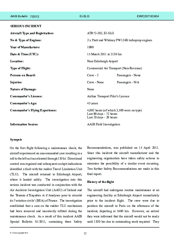AAIB Bulletin 7/2012 EW/C2011/03/04, ATR72-202, EI-SLG, near Edinburgh Airport, 15 Mar 2011