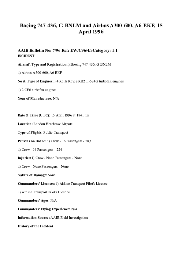 AAIB Bulletin 7/96 EW/C96/4/5, Boeing 747-436, G-BNLM / Airbus A300-600, A6-EKF, Heathrow, 15 Apr 19
